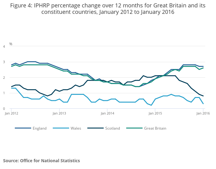 Download this chart Figure 4: IPHRP percentage change over 12 months for Great Britain and its constituent countries, January 2012 to January 2016