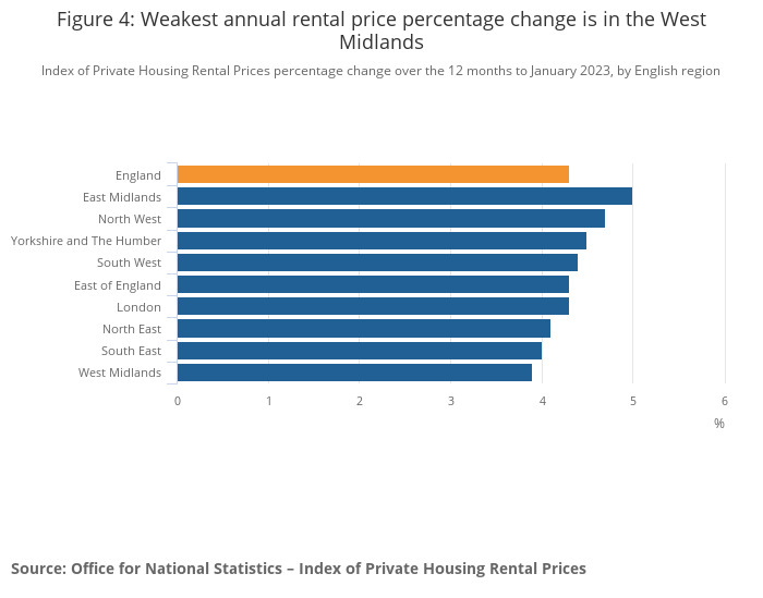 Of the English regions, the lowest annual rental price percentage change in the 12 months to January 2023 was in the West Midlands at 3.9%.