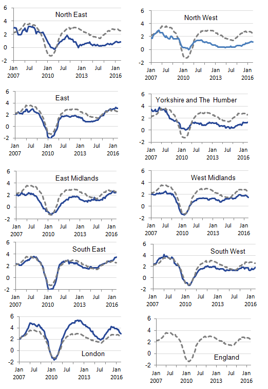 Download this image Figure 7: IPHRP percentage change over 12 months by English region, January 2006 to July 2016