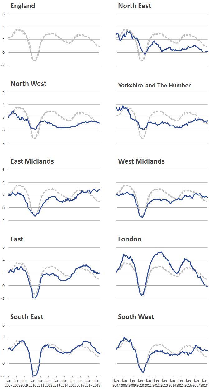 Download this image Figure 6: Index of Private Housing Rental Prices percentage change over 12 months by English region, January 2007 to June 2018
