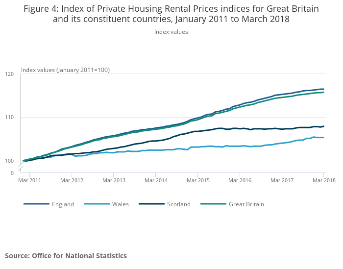 In England, private rental prices grew by 1.1%, Wales saw growth of 1.2% while Scotland saw rental prices increase by 0.7% in the 12 months to March 2018.