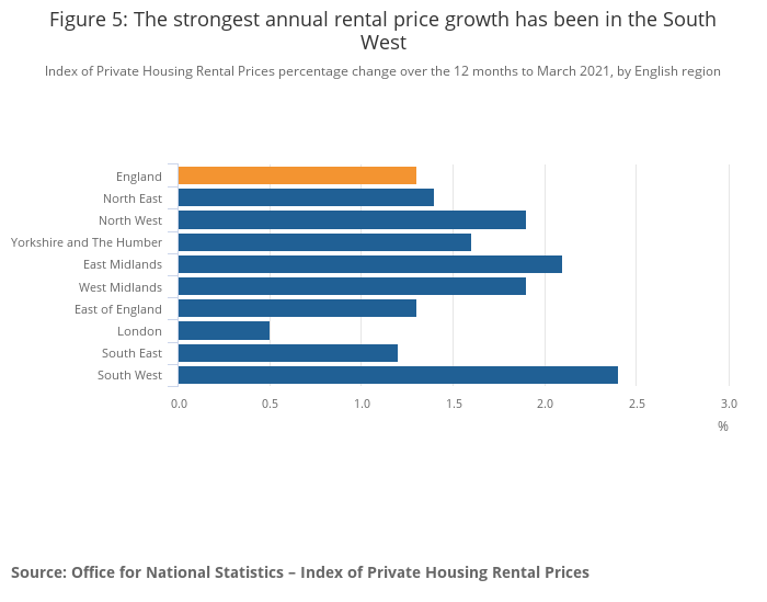 The lowest annual rental price growth was in London where rental prices increased by 0.5% in the 12 months to March 2021. This was followed by the South East, at 1.2%.