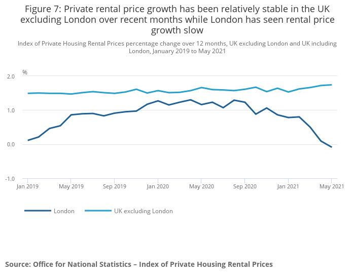 In the 12 months to May 2021, rental prices for the UK excluding London increased by 1.7%, unchanged since March 2021 (Figure 1). London private rental prices decreased by 0.1% in the 12 months to May 2021, down from an increase of 0.1% in April 2021.