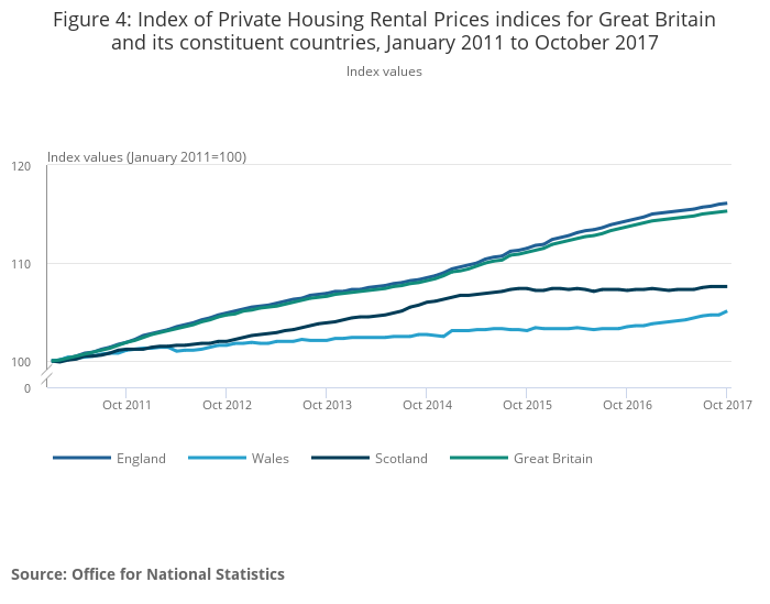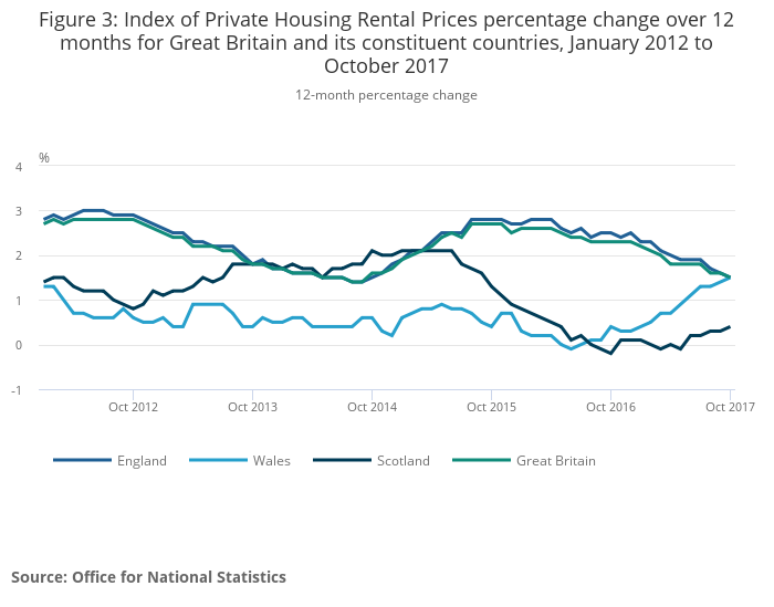 - In England, private rental prices grew by 1.5%, Wales also saw growth of 1.5% while Scotland saw rental prices increase by 0.4% in the 12 months to October 2017.