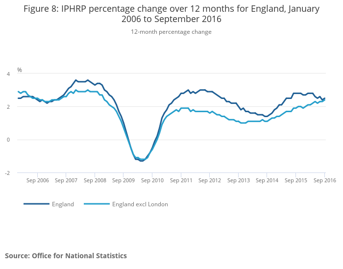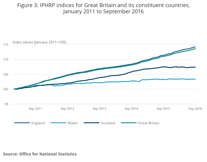 Private rental prices grew by 2.5% in England, fell by 0.1% in Scotland and grew by 0.1% in Wales in the 12 months to September 2016.