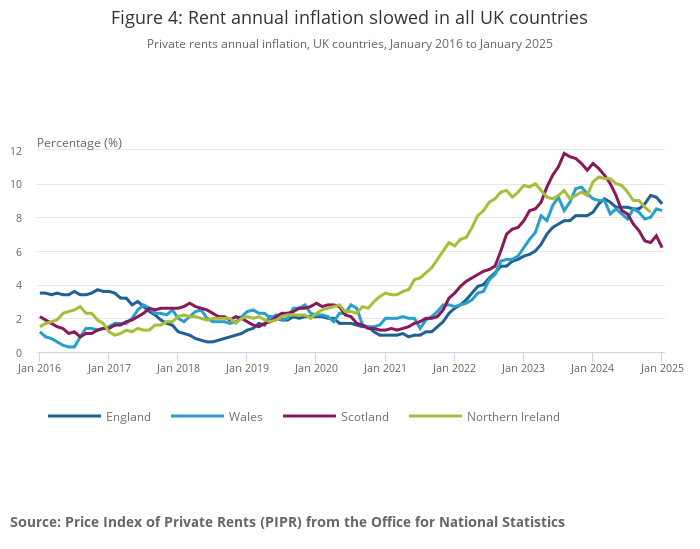Average UK private rents increased by 8.7% in the 12 months to January 2025 (provisional estimate); this is down from 9.0% in the 12 months to December 2024.