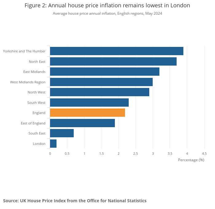 Annual house price inflation was lowest in London, an increase of 0.2% in the 12 months to May 2024. This was up from a decrease of 3.6% in the 12 months to April 2024, and the first positive annual growth in London since May 2023.