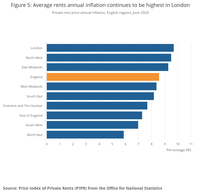 In England, rents inflation was highest in London (9.7%) and lowest in the North East (5.9%), in the 12 months to June 2024.