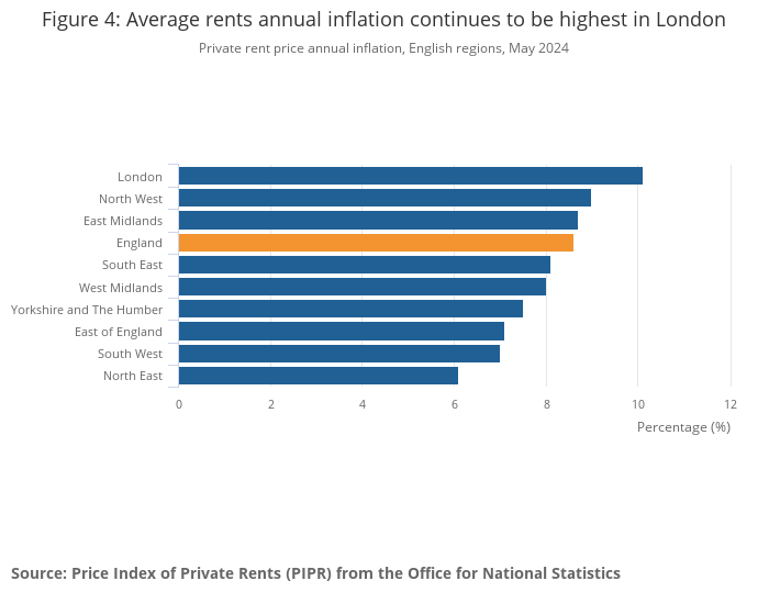 In England, rents inflation was highest in London (10.1%) and lowest in the North East (6.1%), in the 12 months to May 2024.