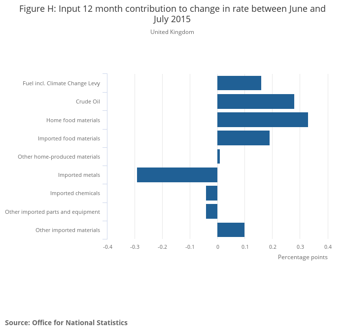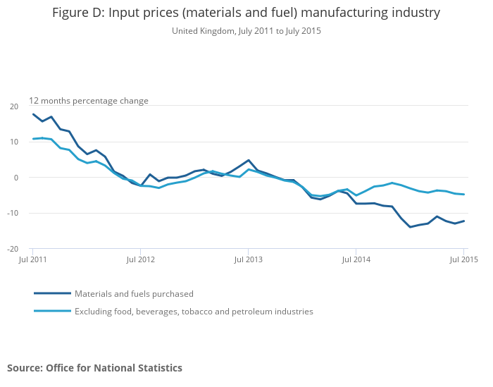 The overall input index for all manufacturing, which measures changes in the price of materials and fuels purchased by manufacturers, fell 12.4% in the year to July 2015, compared with a fall of 13.1% in the year to June 2015. The main downward contributions to the index came from crude oil, home-produced food and imported metals (down 39.9%, 8.7% and 13.1% respectively in the year to July 2015).