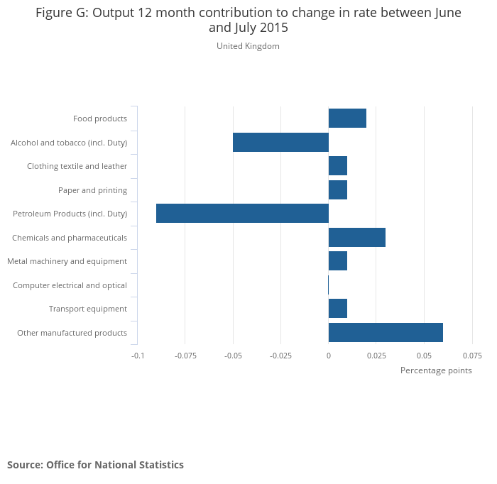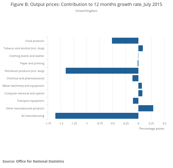 The price of goods bought and sold by UK manufacturers, as estimated by the producer price index, continued to fall in the year to July 2015. Crude oil continued to drive down input prices, feeding through to a drop in output prices of petroleum products
