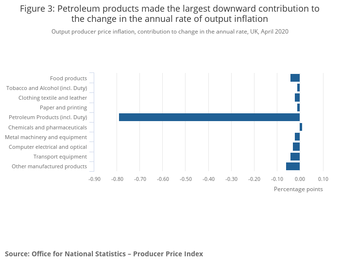 The headline rate of output inflation for goods leaving the factory gate was negative 0.7% on the year to April 2020, down from 0.3% in March 2020.
