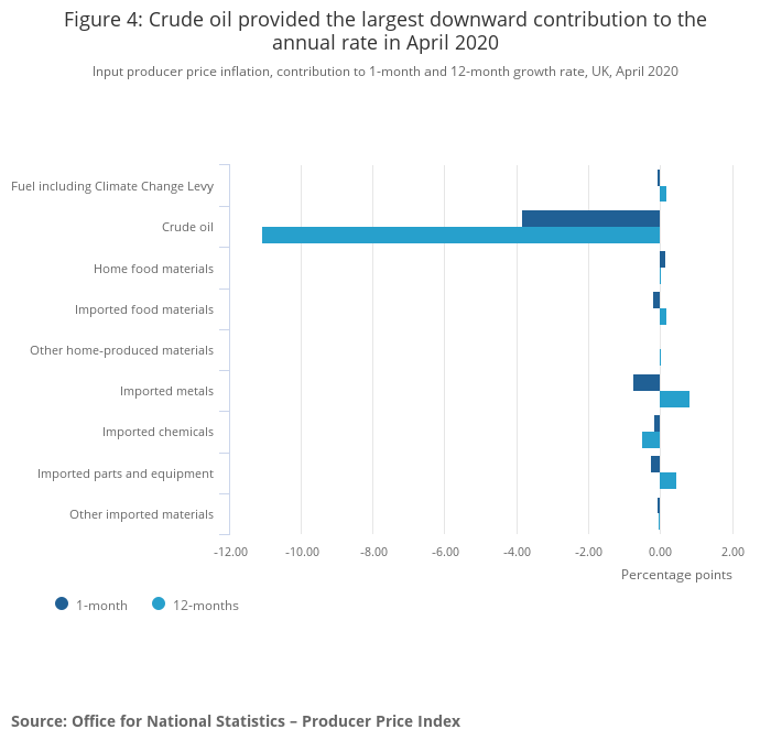 On the month, crude oil also provided the largest downward contribution of 3.82 percentage points, with prices falling by 34.1%. This follows another large monthly drop in crude oil prices of 29.6% in March. These are the lowest the monthly rates have ever been since records began in January 1996.