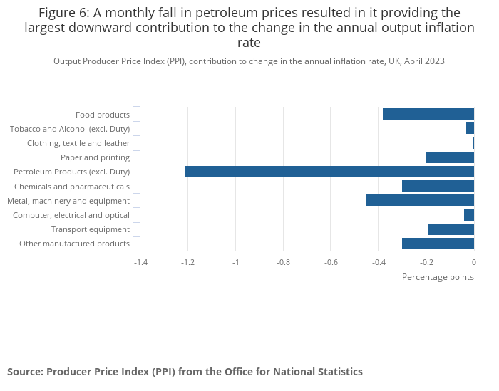 Output Producer Price Index (PPI), contribution to change in the annual inflation rate, UK, April 2023
