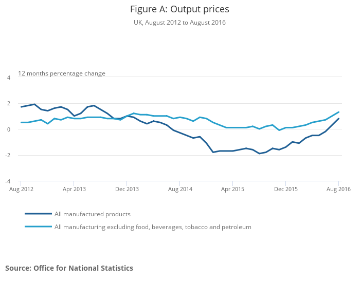 Factory gate prices (output prices) for goods produced by UK manufacturers rose 0.8% in the year to August 2016, compared with a rise of 0.3% in the year to July 2016.