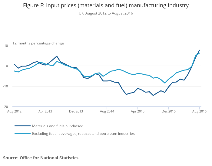 The overall price of materials and fuels bought by UK manufacturers for processing (total input prices) rose 7.6% in the year to August 2016, compared with a rise of 4.1% in the year to July 2016. The large rise in the August 12-month rate was mainly as a result of a large fall in the index in August 2015 which was driven by falling prices for crude oil.