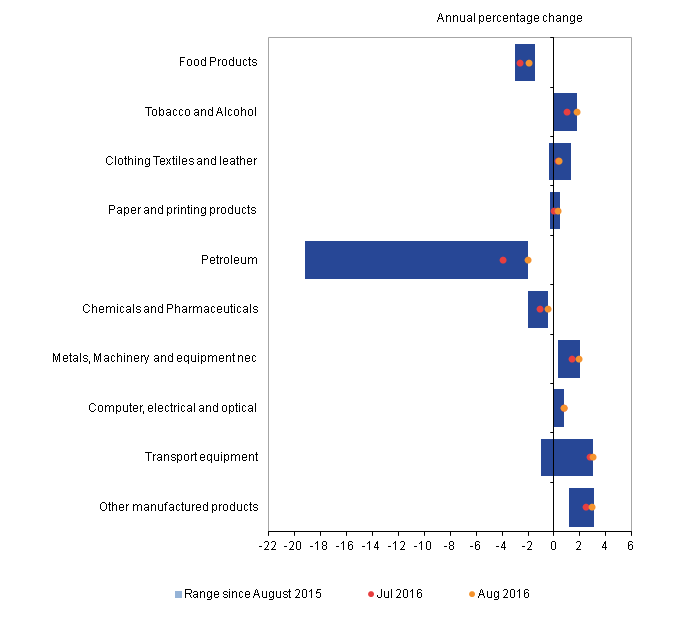 The increases were offset slightly by food products, which decreased 1.9% in the year to August 2016, compared with a fall of 2.6% in the year to July 2016. Decreases in other food products, dairy products and preserved meat and meat products were the largest contributors.
