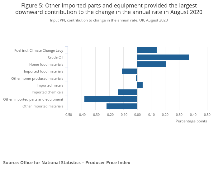 Further negative contributions came from imported chemicals, imported food materials and other home-produced materials. The downward contributions to the change in the rate were offset by positive contributions from the remaining product groups, with crude oil providing the largest contribution at 0.37 percentage points. This upward contribution to the change in the rate from crude oil reflects a base effect, as whilst crude oil fell by 1.6% between July and August 2020, it fell by a much bigger amount between the same months last year.