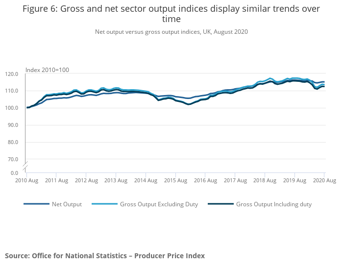 Producer Price Indices (PPIs) are measured on two different bases: gross and net of inter-sector sales. Gross sector PPIs include products sold by one business to another business classified to the same industry sector. Net sector PPIs exclude (net out) products sold by a business to another business classified to the same industry sector. The Office for National Statistics (ONS) currently headlines with net sector PPIs, which include duty. We will move our headline to a gross sector basis excluding duty after November 2020, in line with international best practice.