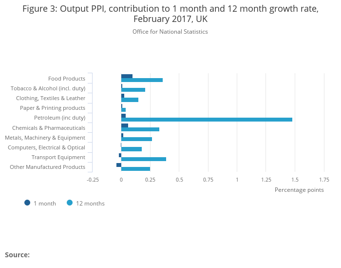 Prices of imported materials and fuels rose 19.0% on the year to February 2017, which is largely the result of a 10.4% depreciation of the sterling effective exchange rate and an 89.3% annual increase in the price of inputs of crude oil. In recent months imported materials and fuels has been the main driver of input PPI inflation as it has a weight of around 68% of the input price index, however, input PPI overall grew at a faster rate.