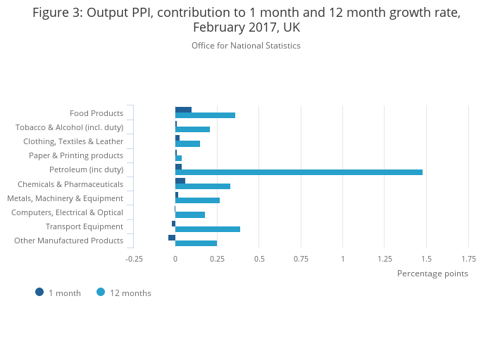Figure 3: Output PPI, contribution to 1 month and 12 month growth rate, February 2017, UK
