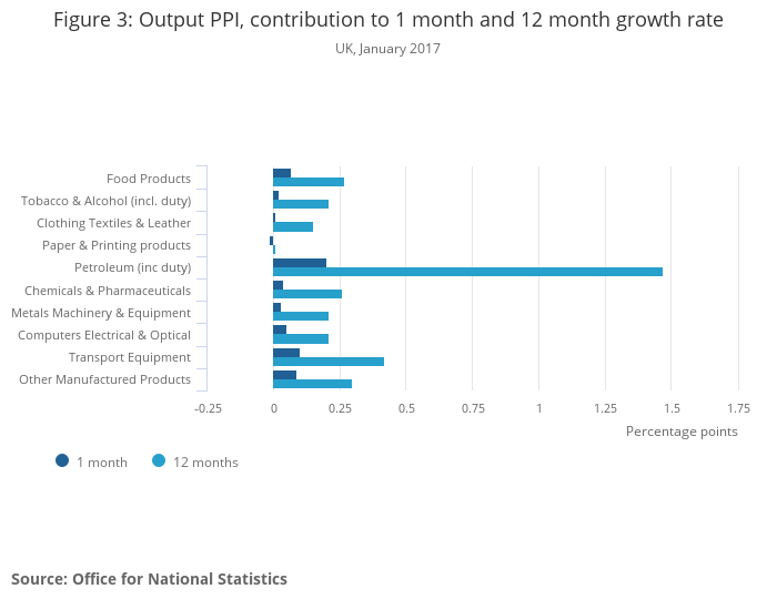 Prices of imported materials and fuels rose 20.2% on the year to January 2017, which is largely the result of a 13.1% sterling depreciation and an 82.1% annual growth rate for imported inputs of crude oil. Imported materials and fuels is the main driver of input PPI inflation as its weight accounts for around 68% of the input price index.