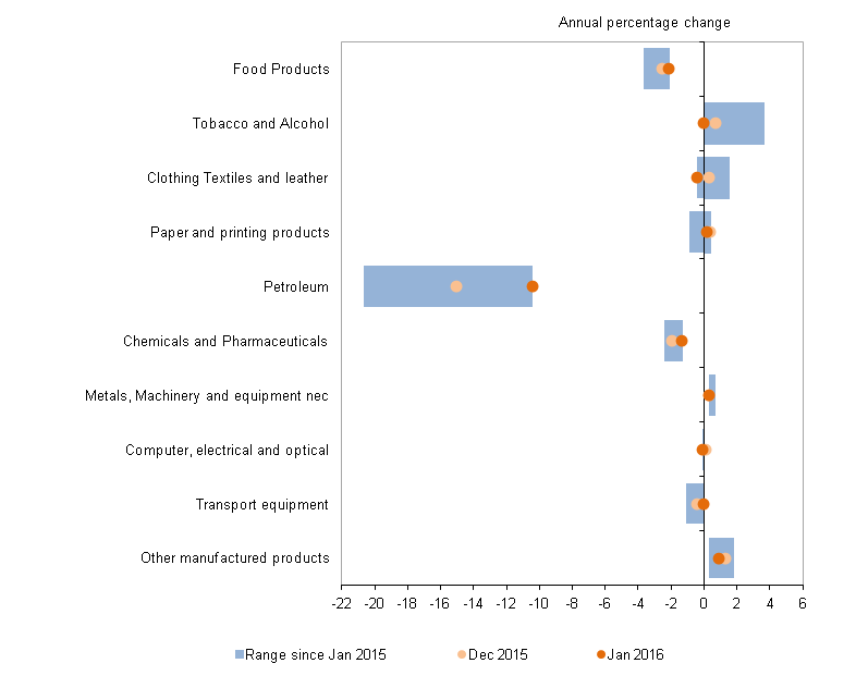 The monthly price index saw a fall of 0.1% between December 2015 and January 2016, up from a fall of 0.3% last month. Although most product groups showed small increases, a large downward contribution from petroleum products has led to an overall fall in the monthly rate (Figure C).