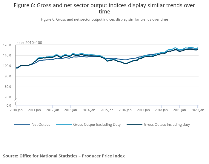 The Office for National Statistics (ONS) currently headlines with net sector PPIs, which include duty. We will move our headline to a gross sector basis excluding duty by summer 2020, in line with international best practice.