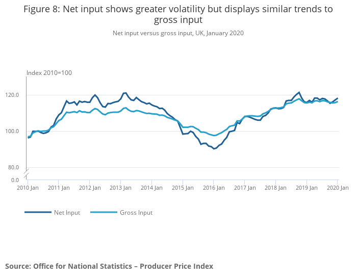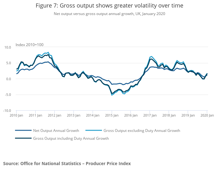 Image .csv .xlsAs shown in Figure 7, gross and net sector output indices display similar trends over time, although the gross indices show higher volatility, particularly at times of high inflation, either positive or negative. For net output PPI, the annual growth was 1.1% in January 2020, up from 0.9% in December 2019. For gross output excluding duty PPI, the annual growth in January 2020 was 1.7%, which is up from 1.0% in December 2019.