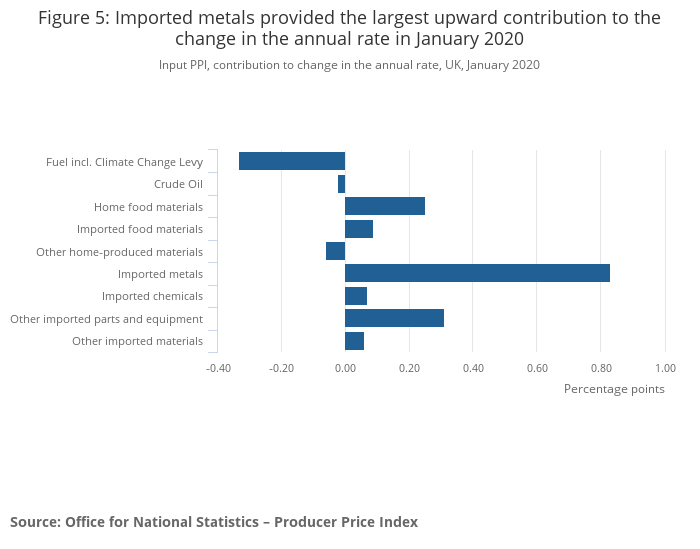 On the month, imported metals provided the largest upward contribution of 0.72 percentage points, with prices rising 7.5% between December 2019 and January 2020.