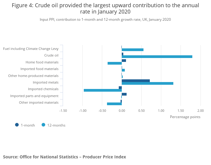 Imported metals provided the largest upward contribution to the change in the rate, at 0.83 percentage points. The annual growth of imported metals increased 9.2 percentage points from 6.6% in December 2019 to 15.8% in January 2020. This is being driven by imported precious metals, non EU. Imported metals saw a large increase of 7.5% between December and January, compared with negative 1.0% growth in the same period 12 months ago, resulting in an upward contribution.