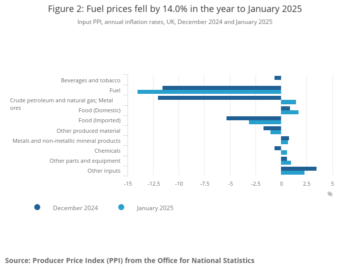 Inputs of fuel provided the largest downward contribution to the input PPI annual inflation rate in January 2025, falling by 14.0%.