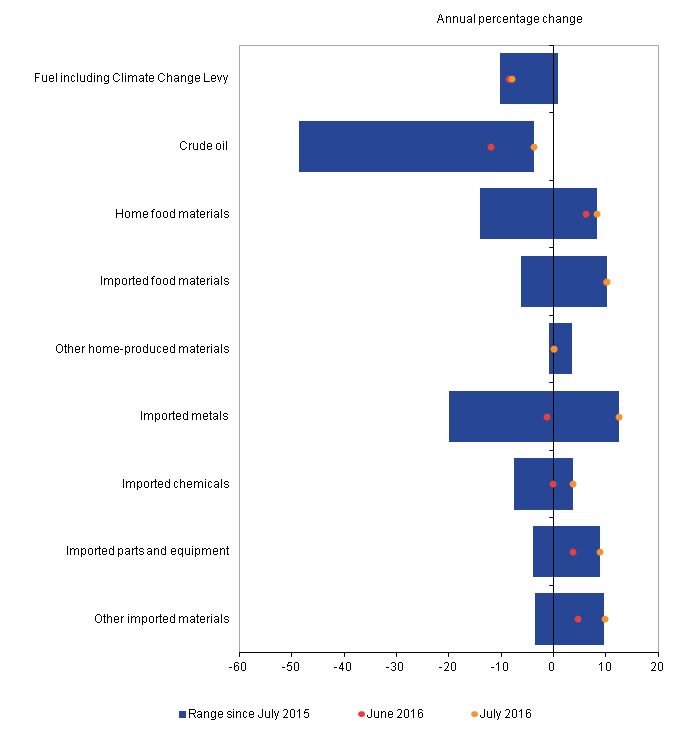 The overall input index for all manufacturing, which measures changes in the price of materials and fuels purchased by manufacturers, rose 4.3% in the year to July 2016, compared with a fall of 0.5% in the year to June 2016. The main upwards contributions to the index came from imported parts and equipment, with smaller, but notable, upward contributions from home food materials and other imported materials.