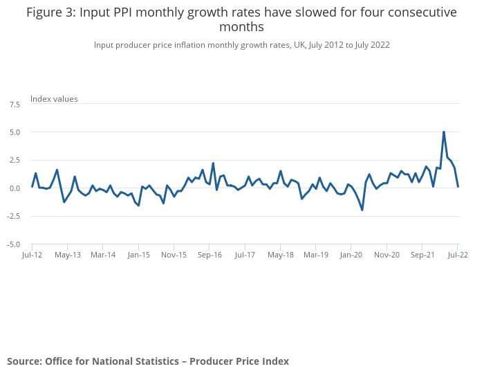 Input producer price inflation monthly growth rates, UK, July 2012 to July 2022