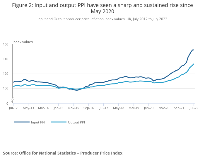Input and Output producer price inflation index values, UK, July 2012 to July 2022
