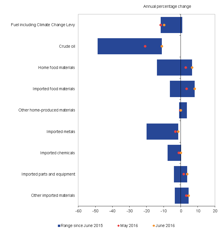 The overall input index for all manufacturing, which measures changes in the price of materials and fuels purchased by manufacturers, fell 0.5% in the year to June 2016, compared with a fall of 4.4% in the year to May 2016. The main downward contributions to the index came from crude oil with smaller, but notable, downward contributions from imports of fuel and imported metals.