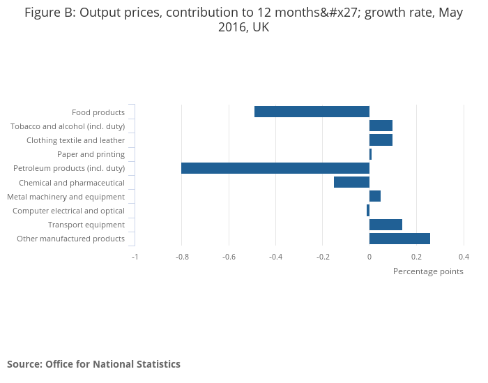 Download this chart Figure B: Output prices, contribution to 12 months' growth rate, May 2016, UK