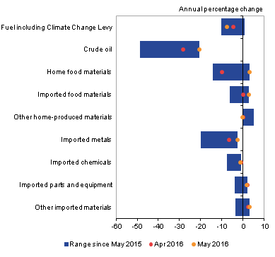 The overall input index for all manufacturing, which measures changes in the price of materials and fuels purchased by manufacturers, fell 3.9% in the year to May 2016, compared with a fall of 7.0% in the year to April 2016. The main downward contributions to the index came from crude oil with a smaller, but notable, downward contribution from imports of fuel.