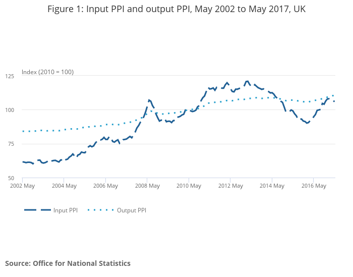 Figure 1: Input PPI and output PPI, May 2002 to May 2017, UK