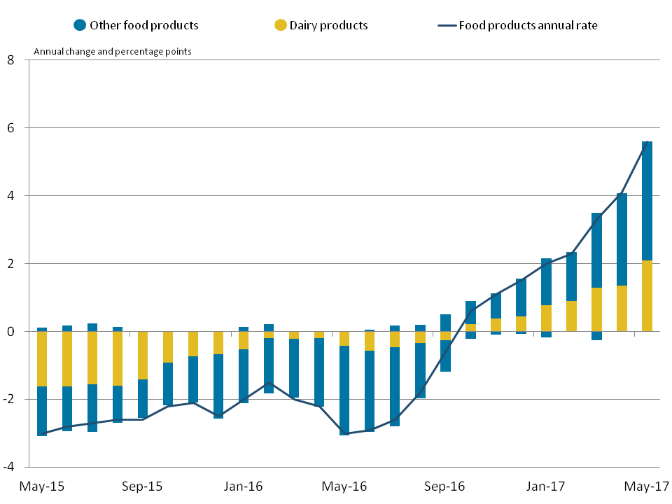 Download this image Figure 7: Annual rate of factory gate inflation for food producers and contributions to the rate, May 2015 to May 2017, UK