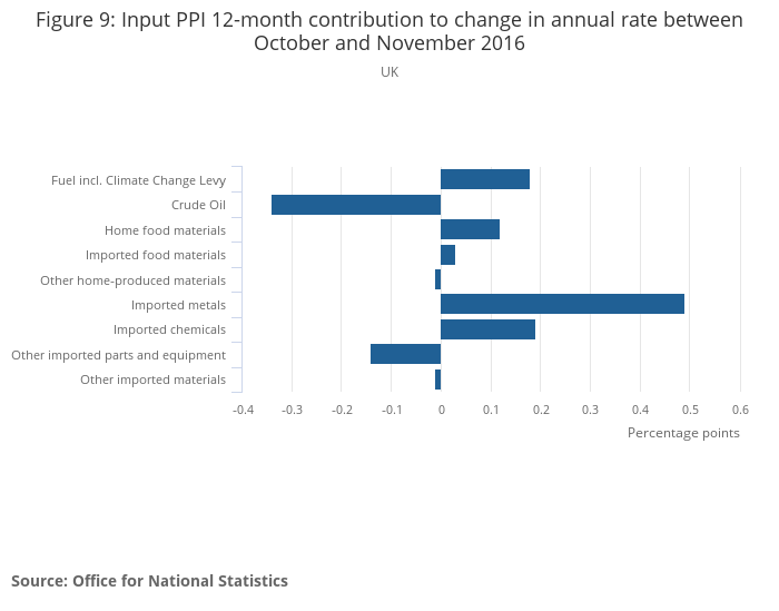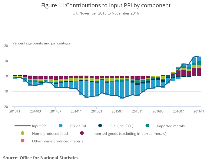The overall input index for all manufacturing, which measures changes in the price of materials and fuels purchased by manufacturers, rose 12.9% in the year to November 2016, compared with a rise of 12.4% in the year to October 2016. The main upwards contributions to the index came from crude oil, imported metals, and imported parts and equipment.