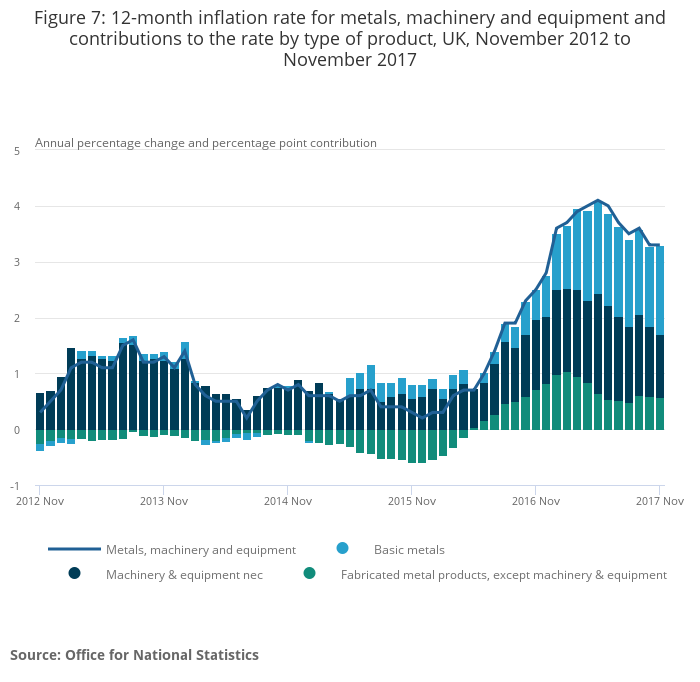 Download this chart Figure 7: 12-month inflation rate for metals, machinery and equipment and contributions to the rate by type of product, UK, November 2012 to November 2017
