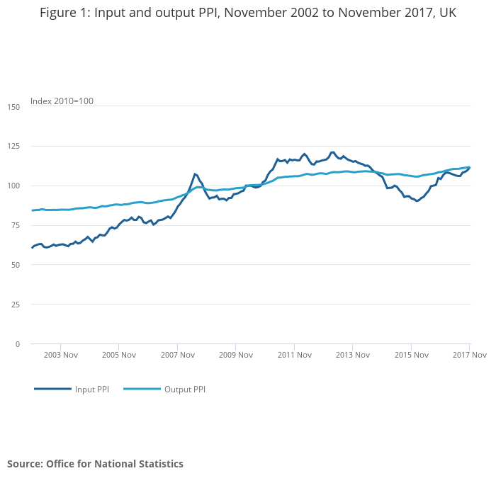 - The headline rate of inflation for goods leaving the factory gate (output prices) rose 3.0% on the year to November 2017, up from 2.8% in October 2017.