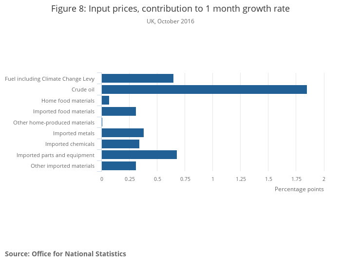 The overall input index for all manufacturing, which measures changes in the price of materials and fuels purchased by manufacturers, rose 12.2% in the year to October 2016, compared with a rise of 7.3% in the year to September 2016. The main upwards contributions to the index came from crude oil, other imported parts and equipment, and imported metals.