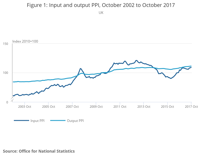 - The headline rate of inflation for goods leaving the factory gate (output prices) rose 2.8% on the year to October 2017, down from 3.3% in September 2017.