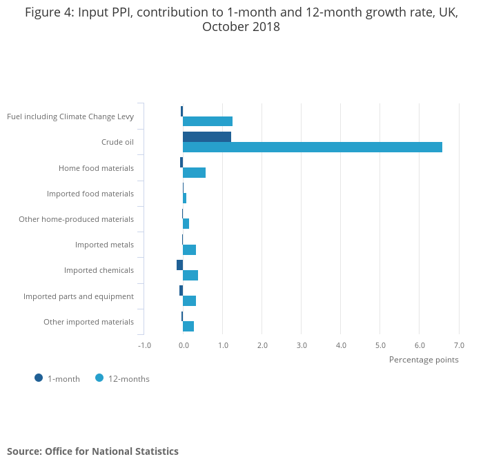 Figure 4: Input PPI, contribution to 1-month and 12-month growth rate, UK, October 2018