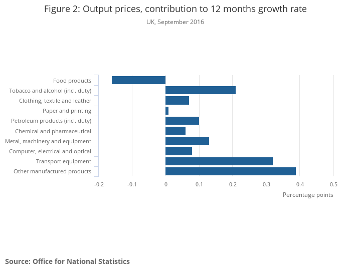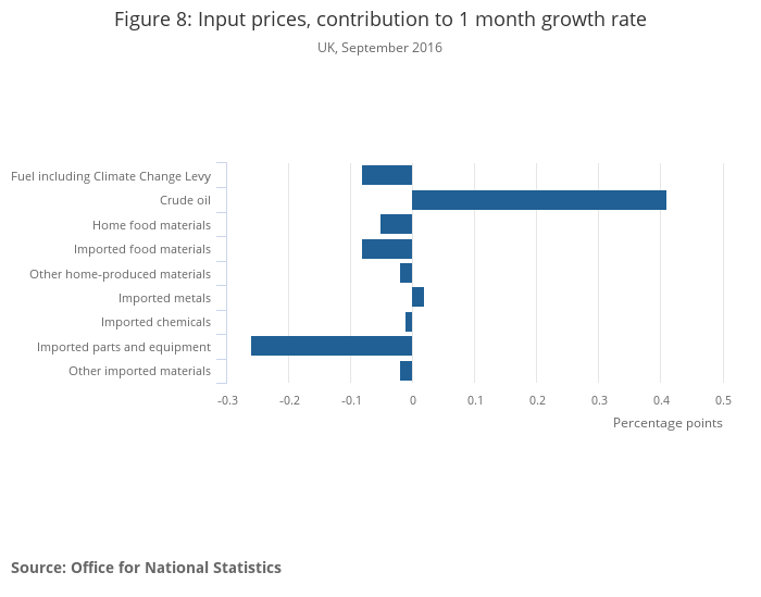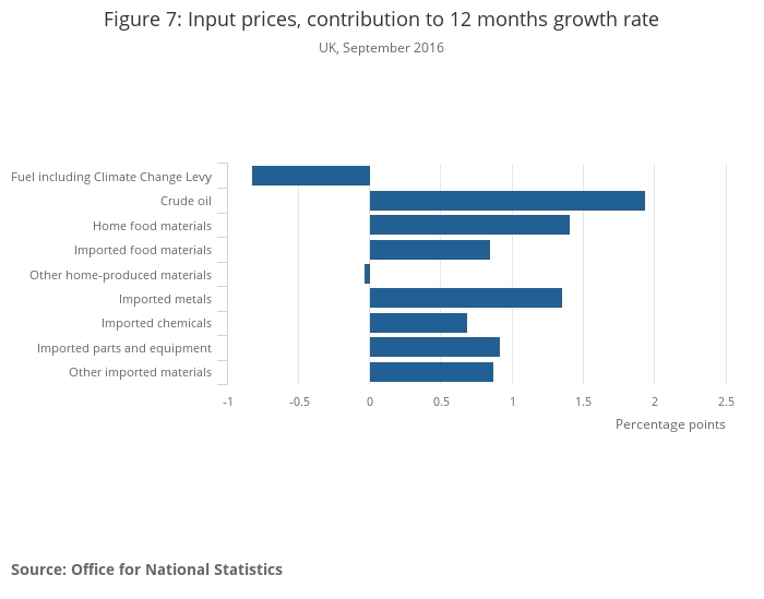 The overall input index for all manufacturing, which measures changes in the price of materials and fuels purchased by manufacturers, rose 7.2% in the year to September 2016, compared with a rise of 7.8% in the year to August 2016. The main upwards contributions to the index came from crude oil, home-produced food, and imported metals.