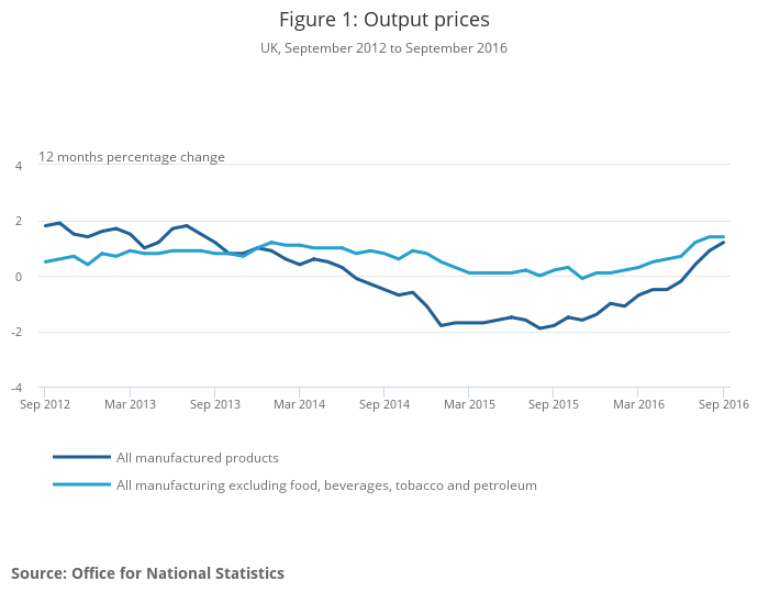 Factory gate prices (output prices) for goods produced by UK manufacturers rose 1.2% in the year to September 2016, compared with a rise of 0.9% in the year to August 2016.