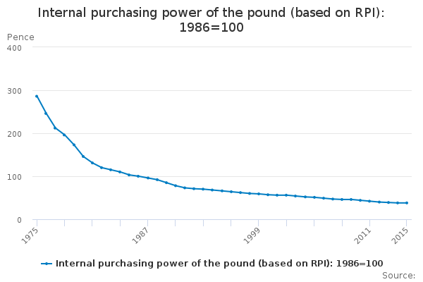 Download this time seriesInternal purchasing power of the pound (based on RPI): 1986=100