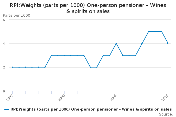 Download this time seriesRPI:Weights (parts per 1000) One-person pensioner - Wines & spirits on sales